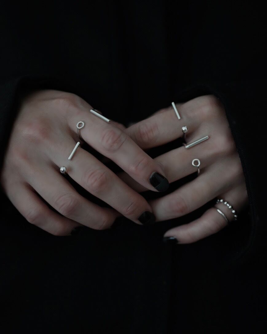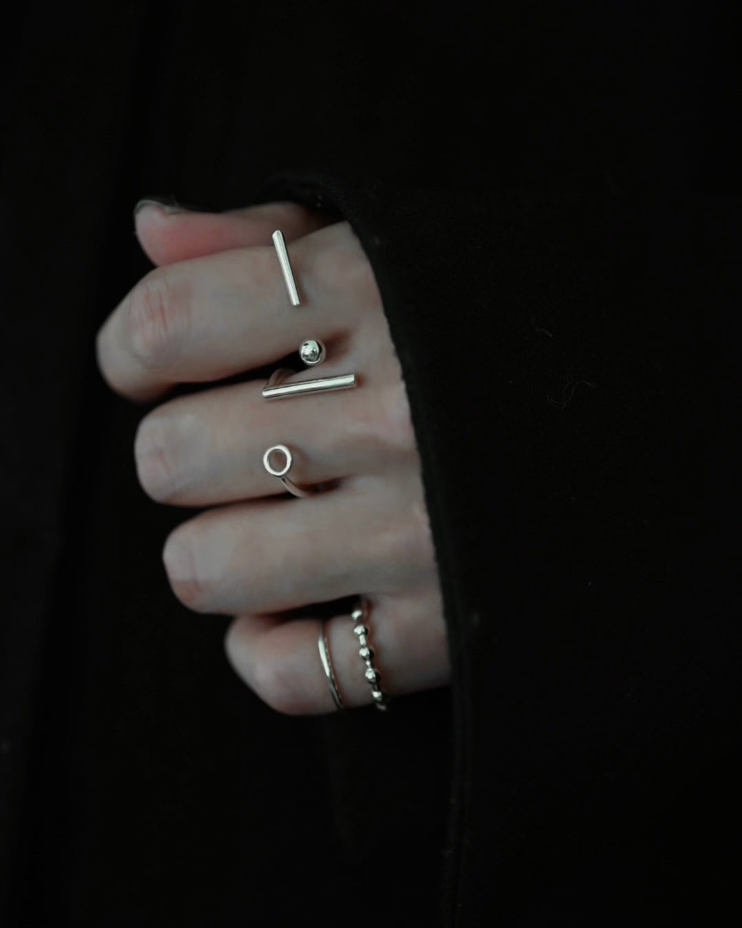 バーの方がほんのわずかに他より太くなっていて、指の上で程よく主張するよう、バーとリングの太さのバランスに拘りました。