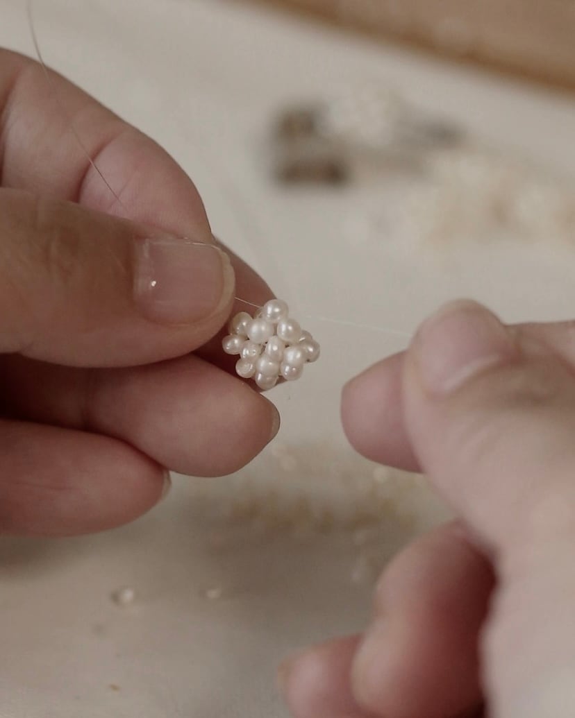 中央に合わせた小粒パールは、一つひとつ手作業で丁寧に編み込んでいます。