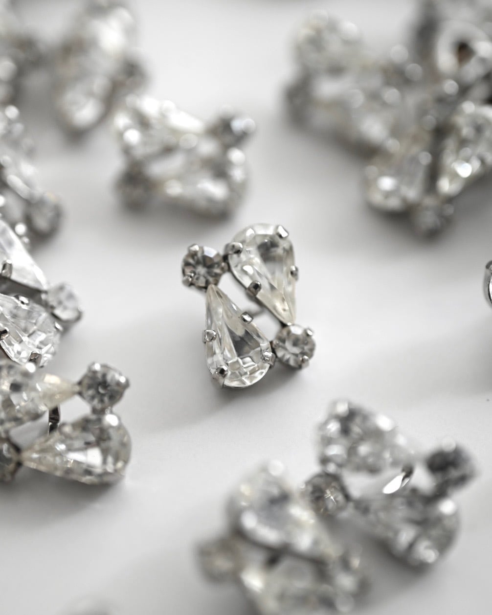 どちらのボタンもメタル台座にセットされたガラスカットが美しく光を反射し、キラキラとした奥行きのある輝きが魅力。