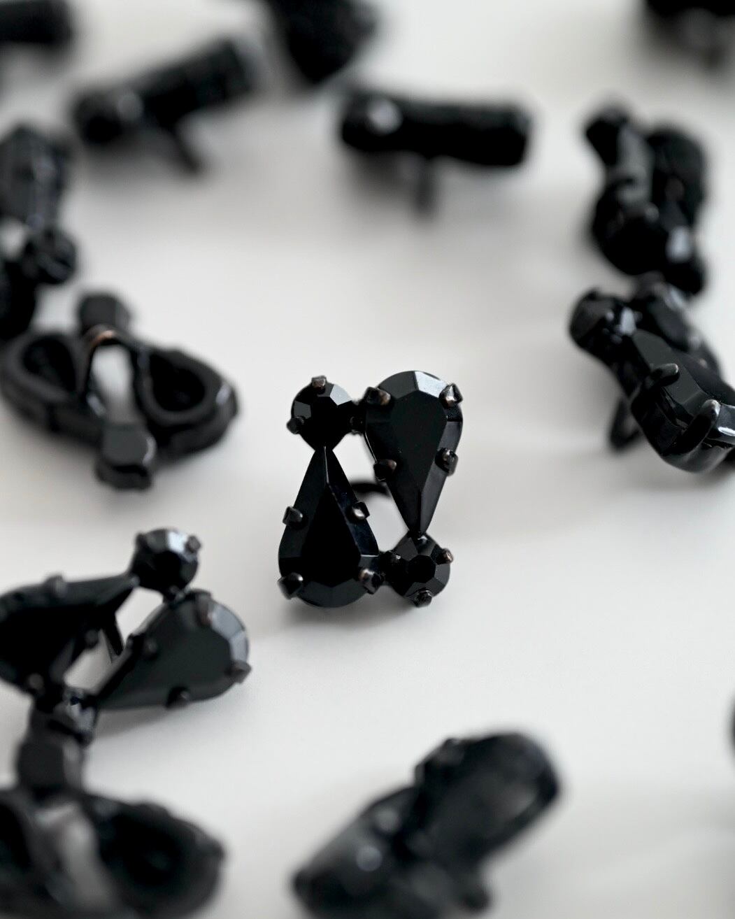 どちらのボタンもメタル台座にセットされたガラスカットが美しく光を反射し、キラキラとした奥行きのある輝きが魅力。