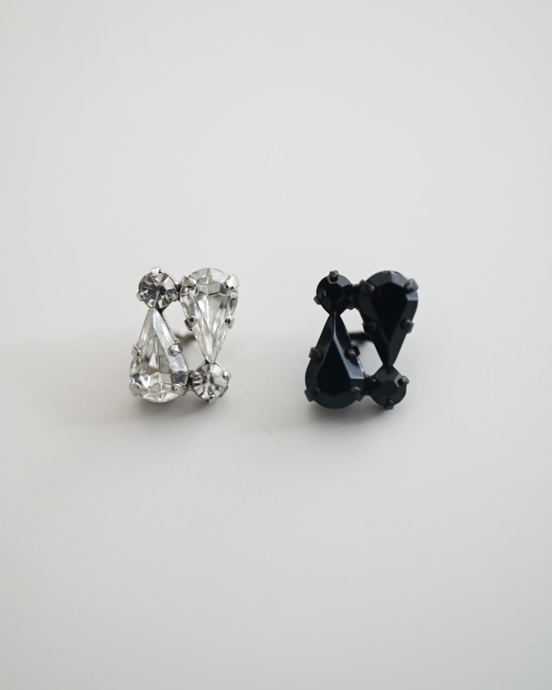 どちらのボタンもメタル台座にセットされたガラスカットが美しく光を反射し、キラキラとした奥行きのある輝きが魅力。
