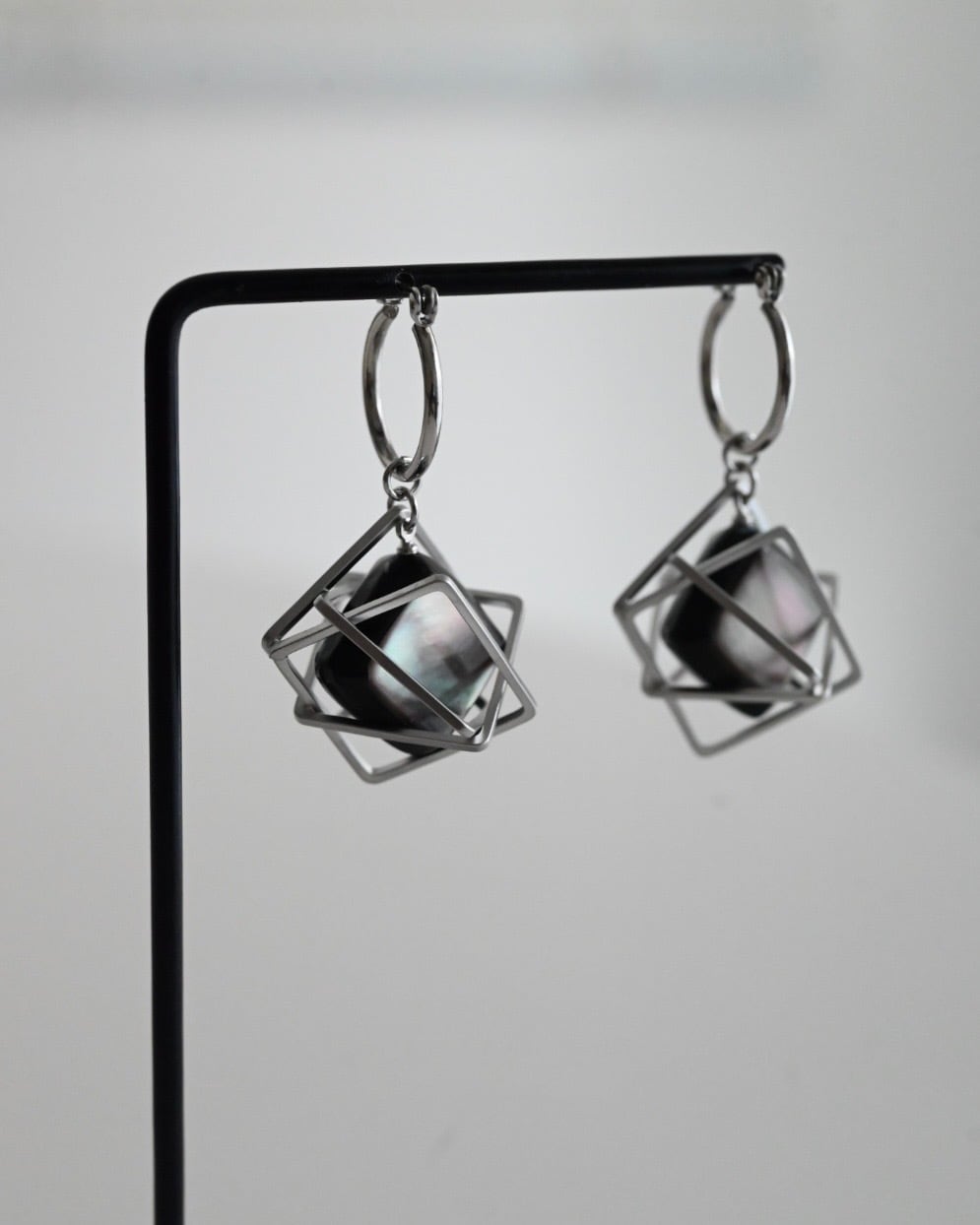 ひときわ目を引く、美しい黒蝶貝のヴィンテージボタンを使用したピアス。