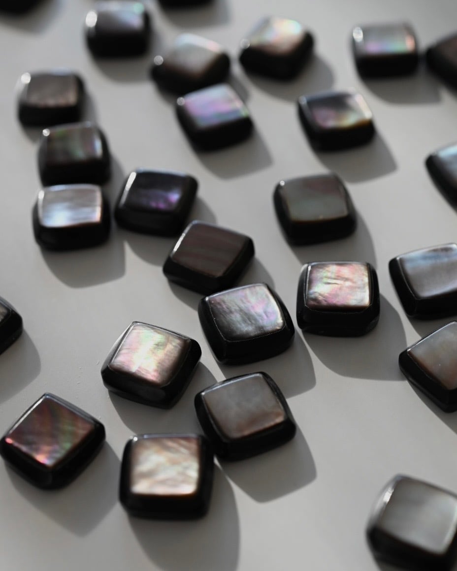 試行錯誤を重ねる中で辿り着いたのは、幾重にもスクエアが組み込まれた造形の中に、黒蝶貝を宝石のように納めるというデザイン。