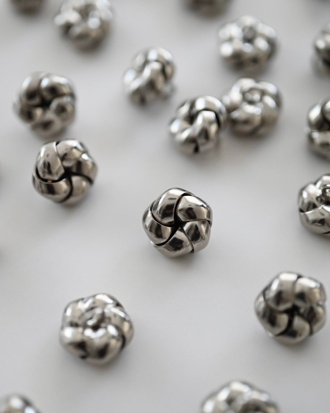 周りにはメタルボールを散りばめ、ボタンのフォルムに合わせて全体の親和性を高めています。