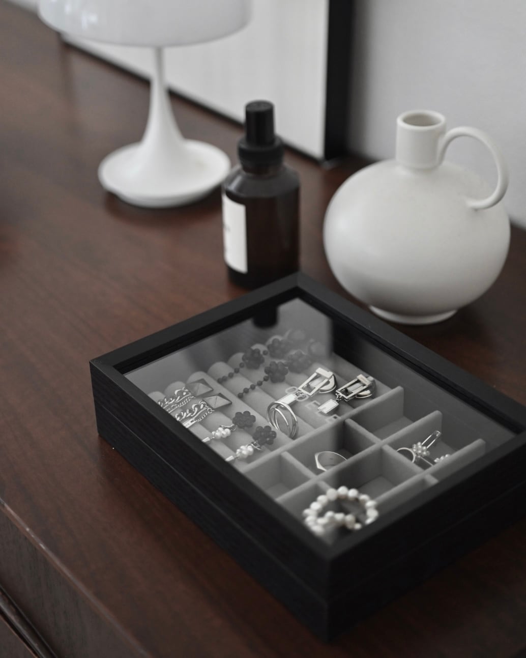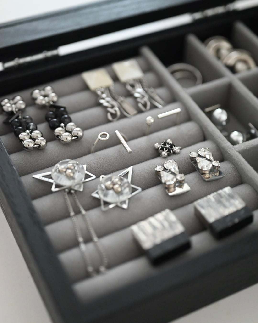 一見リング用のスペースが広く見えますが、そこへピアス(イヤリング)を差し込むことで、お気に入りやスタメンアクセサリーを美しくディスプレイしていただけます。